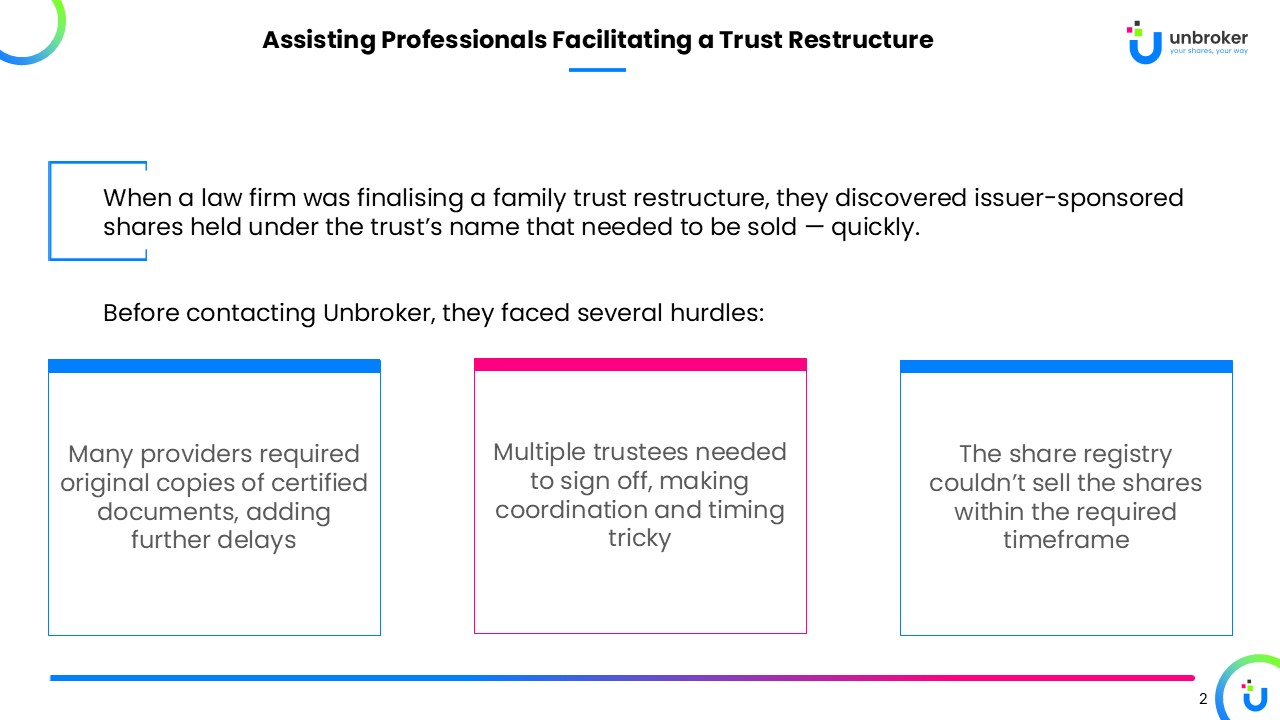 Unbroker is Australia’s trusted one-off share sale specialist. We make it fast and easy to sell issuer-sponsored shares without opening or using a trading account.