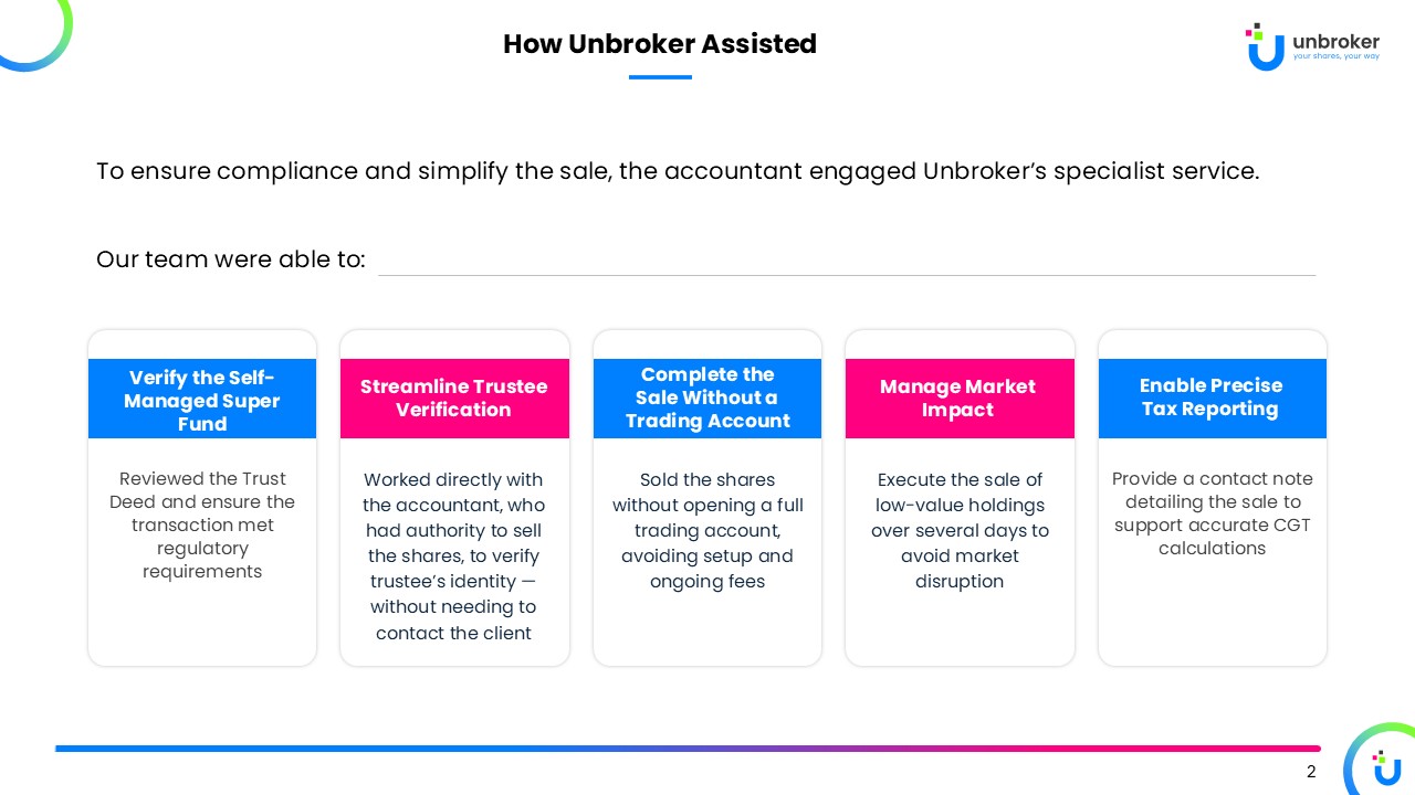 Unbroker is Australia’s trusted one-off share sale specialist. We make it fast and easy to sell issuer-sponsored shares without opening or using a trading account.